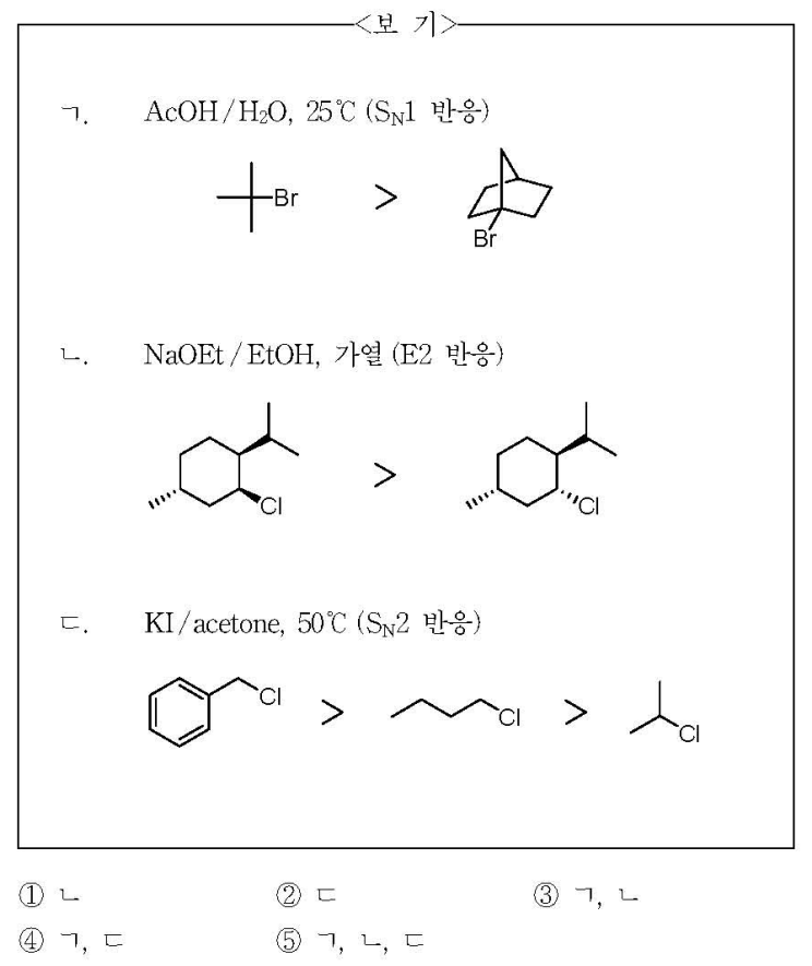 9. 할로젠화 알킬 화합물에 대한 각 반응 조건에서의 상대 속도 비교가 옳은 것만을 ⟨보기⟩에서 있는 대로 고른 것은?