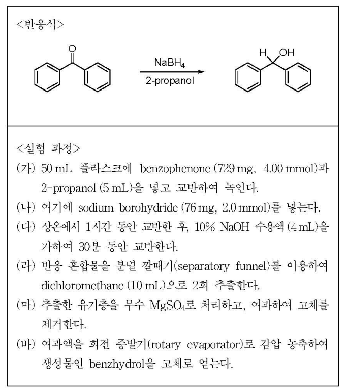 15. 다음은 benzophenone을 benzhydrol로 환원시키는 ⟨반응식⟩과 ⟨실험 과정⟩이다. 이 실험에서 사용하는 시약 또는 용매를 다른 것으로 대체하여 실험할 경우, 가장 적절하지 않은 것은?