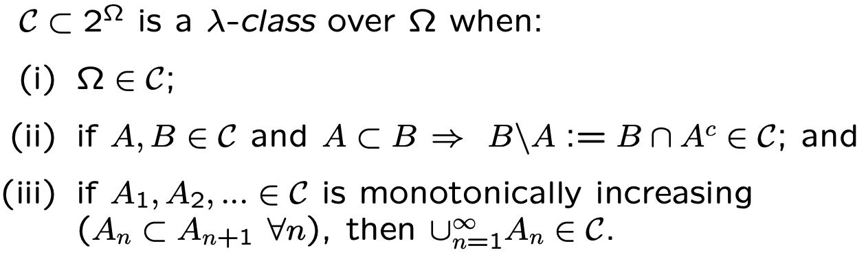 ④ Dynkin's theorem : 𝒟가 π-class, 𝒞가 λ-class, 𝒟 ⊂ 𝒞이면, σ(𝒟) ⊂ 𝒞